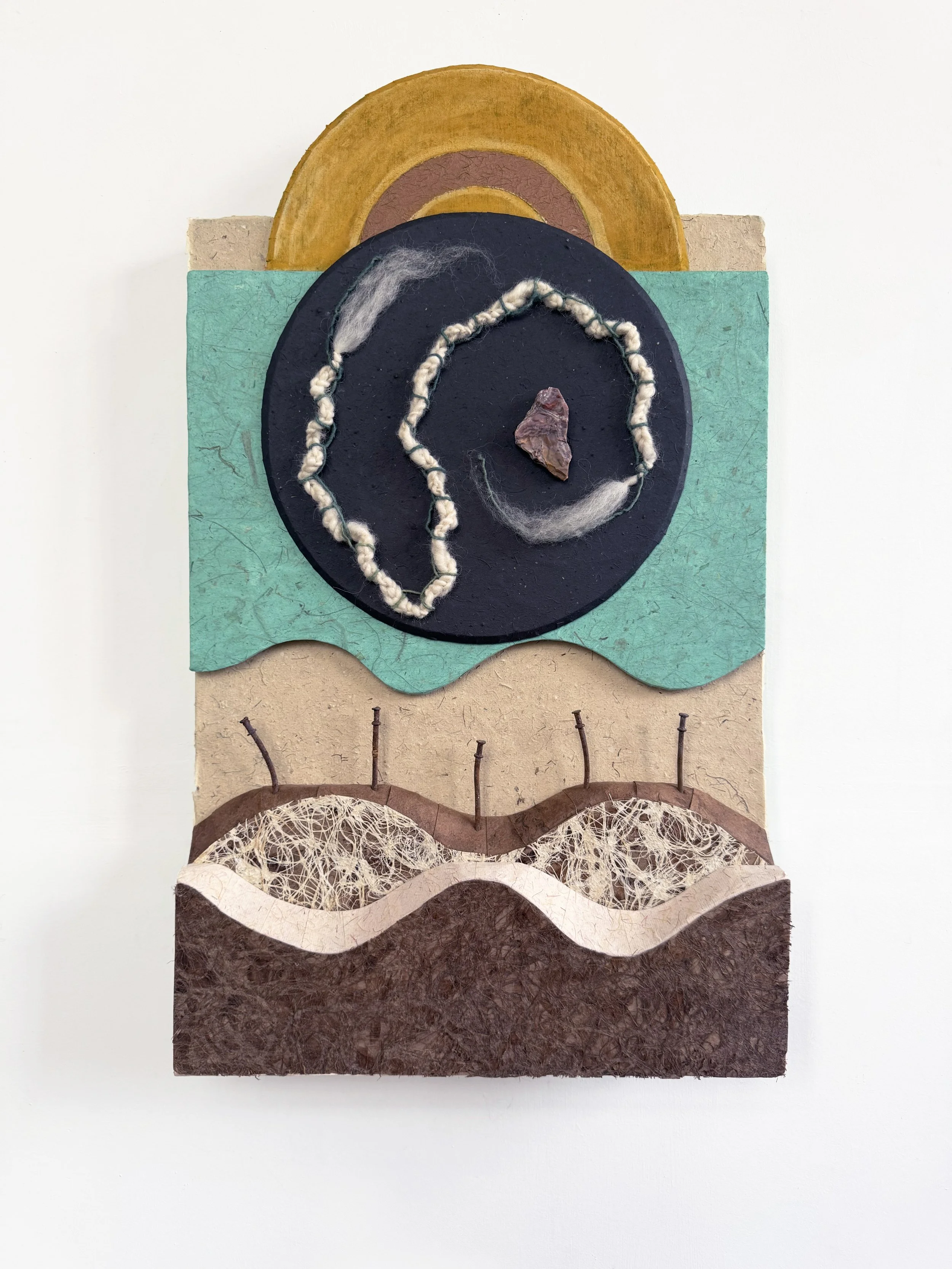 Assemblage with various papers, petrified wood, rusty nails, ochre pigment, and hand spun yarn